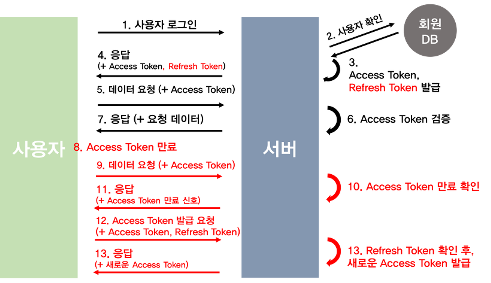 10~11. 서버는 Access Token이 만료됨을 확인하고 권한없음을 신호로 보낸다.
