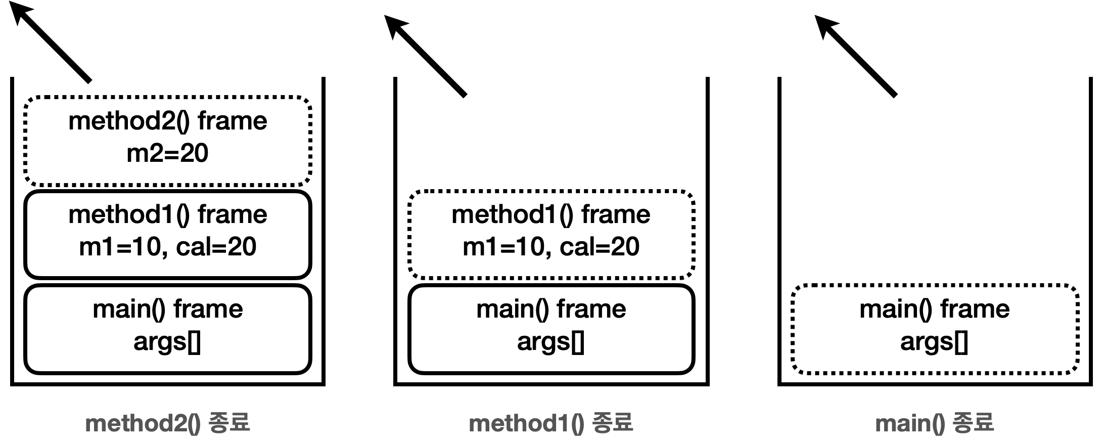 - method2()가 종료됩니다. 이때 method2() 스택 프레임이 제거되고, 매개변수 m2도 제거됩니다. method2() 스택 프레임이 제거 되었으므로 프로그램은 method1()로 돌아갑니다. 물론 method1()을 처음부터 시작하는 것이 아니라 method1() 에서 method2() 를 호출한 지점으로 돌아갑니다.