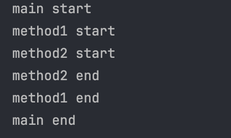 - main()은 System.out.println("main start") 을 지나 method1을 호출합니다. method1() 스택 프레임이 생성됩니다.
