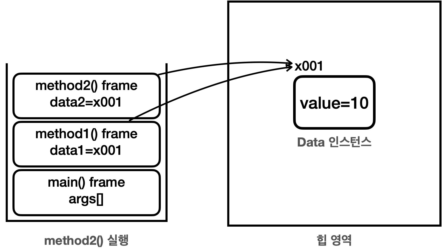 - 이제 method1()에 있는 data1과 method2()에 있는 data2 지역 변수는 둘 다 같은 인스턴스를 참조합니다.