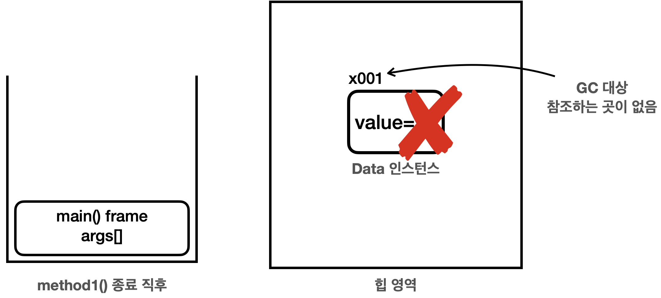 - method1()이 종료된 직후, data2, data1까지 함께 제거되었으며, x001 참조값을 가진 Data 인스턴스를 참조하는 곳이 없습니다.