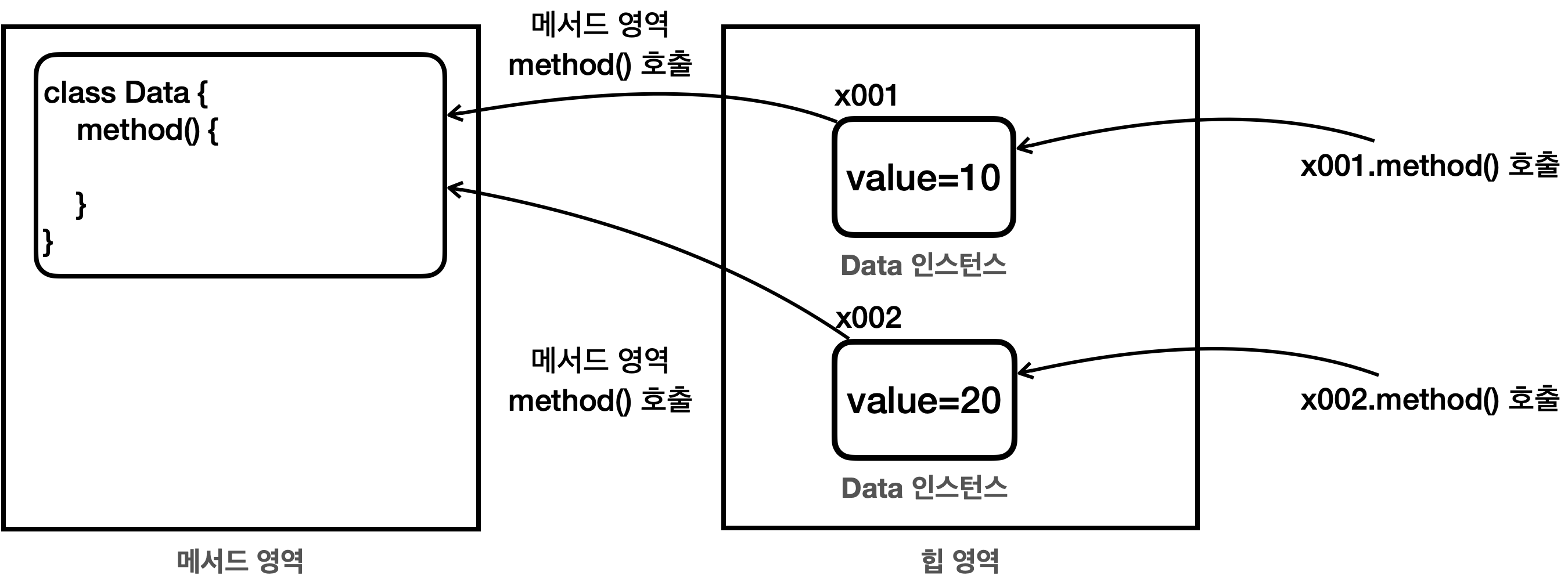 - 즉 메서드는 메서드 영역에서 공통으로 관리되고 실행되며, 메서드를 호출하면 실제로는 메서드 영역에 있는 코드를 불러서 수행합니다.