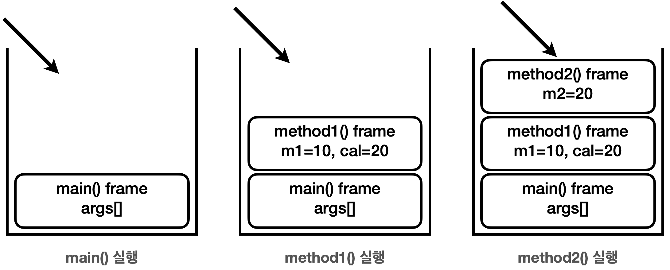 - method1()는 m1, cal 지역 변수(매개변수 포함)를 가지므로 해당 지역 변수들이 스택 프레임에 포함됩니다.