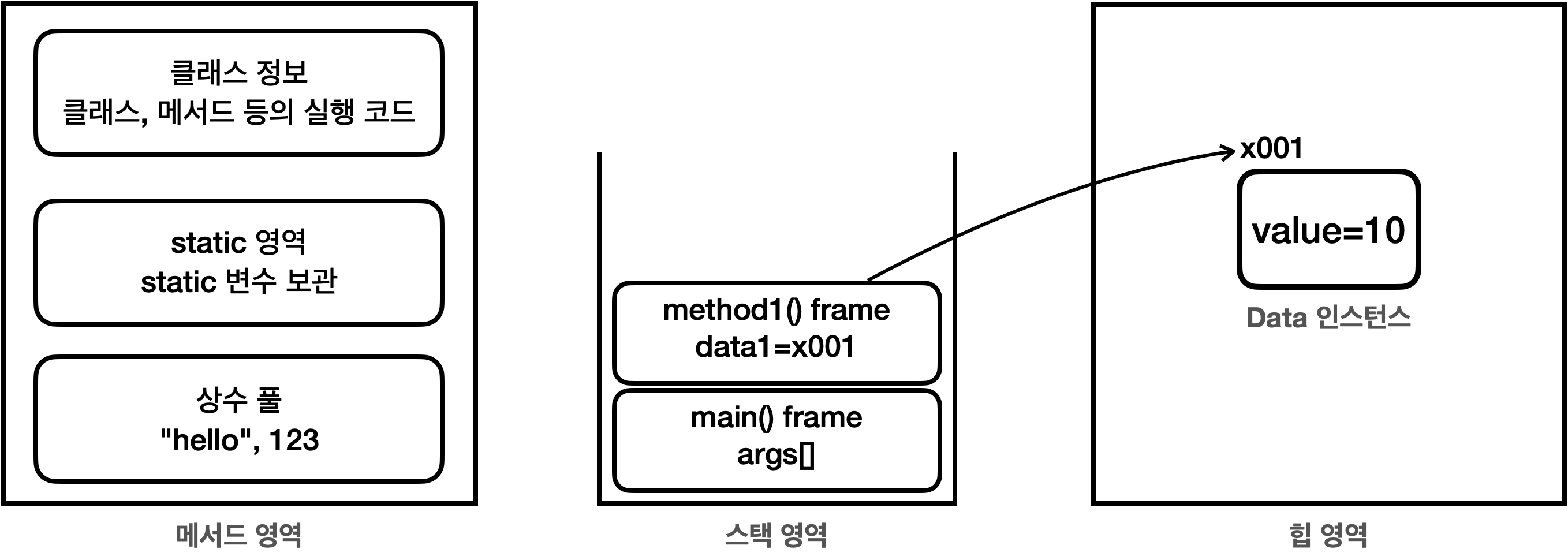 - method1()은 method2()를 호출하면서 Data data2 매개변수에 참조값을 넘깁니다.