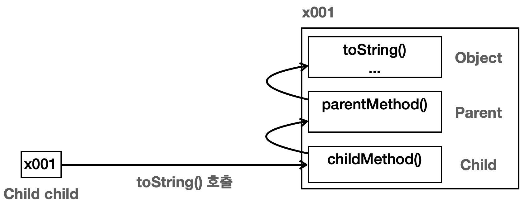 위 코드와 그림을 보면, toString()메서드가 어디서 왔는지 알 수 있습니다. 기본적으로 child와 parent에는 toString 메서드가 없는데, 현재 사용하고 있습니다.