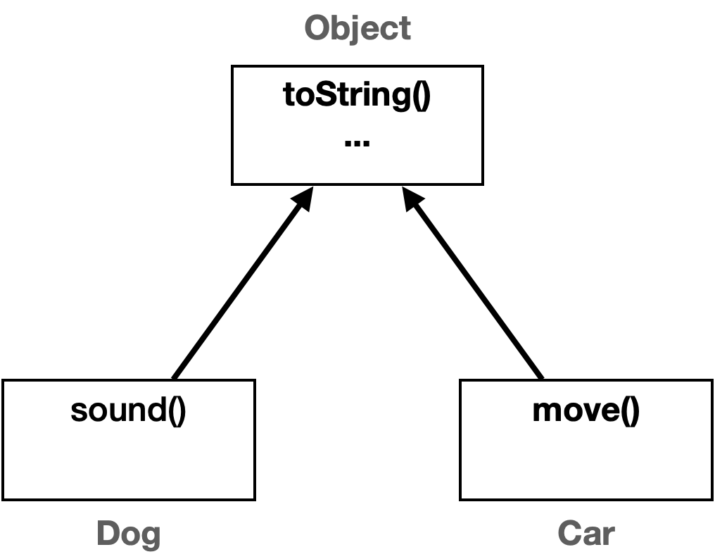 여기서 Dog와 Car는 서로 아무런 관련이 없는 클래스입니다. 둘 다 부모가 없으므로 Object를 자동으로 상속받습니다.