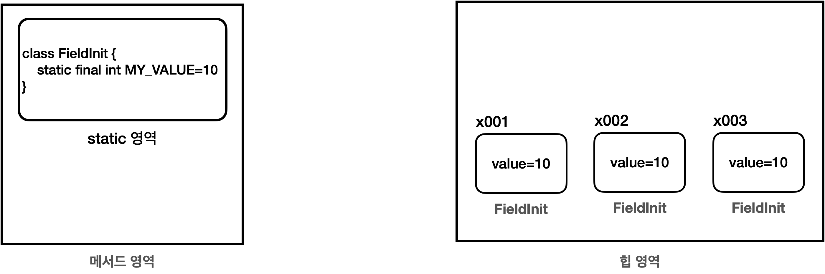 - FieldInit과 같이 final필드를 필드에서 초기화 하는 경우, 모든 인스턴스가 다음 오른쪽 그림과 같이 같은 값을 가진다.