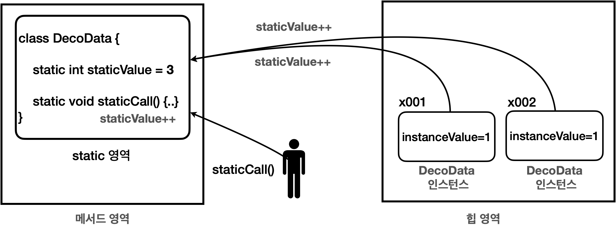 정적(static)은 고정된이란 의미를 가지고 있습니다. Static이라는 키워드를 사용하여 Static변수와 Static메소드를 만들 수 있는데 다른말로 정적필드와 정적 메소드라고도 하며 이 둘을 합쳐 정적 멤버라고 합니다.(클래스 멤버라고도 합니다.) 정적 필드와 정적 메소드는 객체(인스턴스)에 소속된 멤버가 아니라 클래스에 고정된 멤버입니다. 그렇기에 클래스 로더가 클래스를 로딩해서 메소드 메모리 영역에 적재할때 클래스별로 관리됩니다. 따라서 클래스의 로딩이 끝나는 즉시 바로 사용할 수 있습니다.