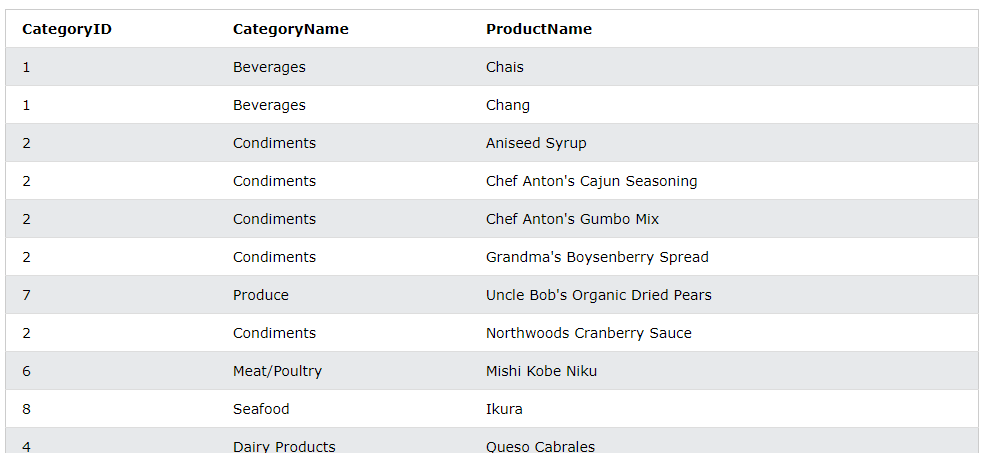 SELECT C.CategoryID, C.CategoryName, P.ProductName