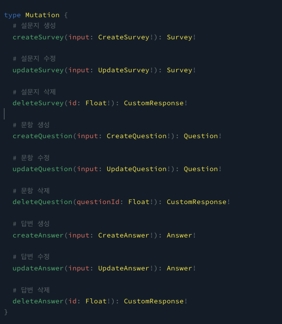 @Mutation(() => Survey, { description: '설문지 수정' })